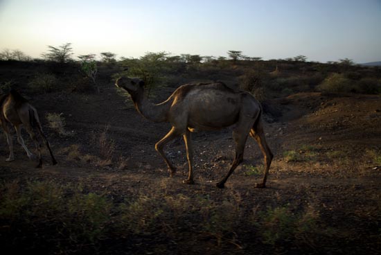 Camels strolling past a matatu outside Lodwar. Photo by Ian MacLellan