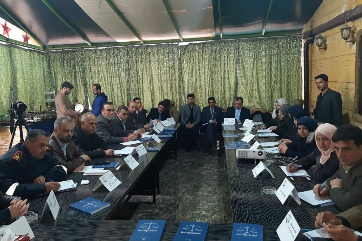IBJ’s Field Coordinator, Hasan al-Mousa, initiated the event with a briefing on the past 4 roundtable events that IBJ held in Daret Azza, Maarat al-Numan, Afrin and Azaz where justice stakeholders discussed early access to justice, women and children’s rights, the suspension of the suspended sentences, and criminal matters resulting from HLP issues respectively. Hasan also laid out the outcomes of each event and how the stakeholders in the justice system made sure the outcomes are implemented.