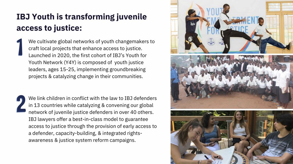 Founded in 2019 by school students, the IBJ youth movement has grown to a network of over 400 young people championing justice and human rights in their communities. We are a Youth for Youth Justice movement connecting human rights defenders and youth globally to respond to pressing justice issues affecting young people today. We empower and engage youth, support child defenders’ and increase access to justice for children in conflict with the law.
